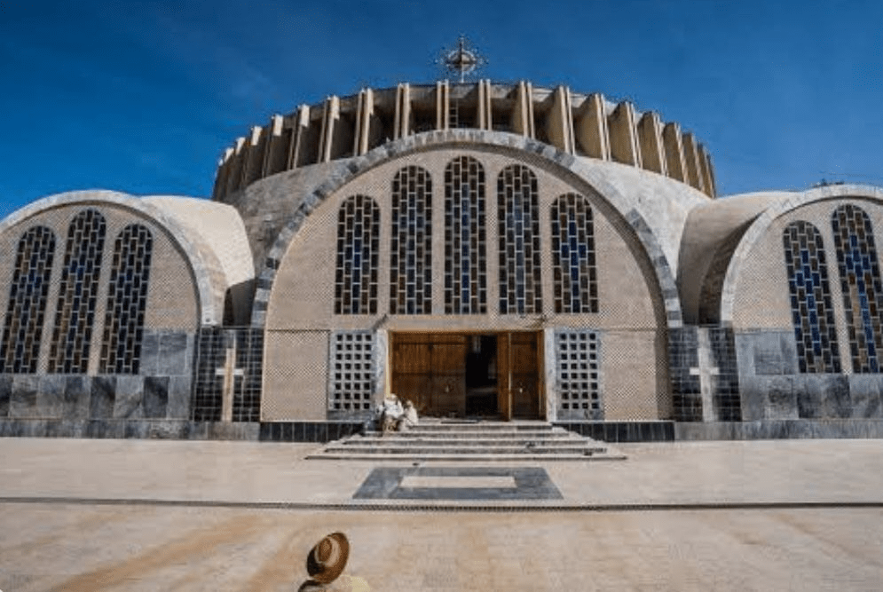 Современный вид православного храма Марии Сионской в Аксуме, построенный в 1964 году в неовизантийском архитектурном стиле. ( Эфиопия).