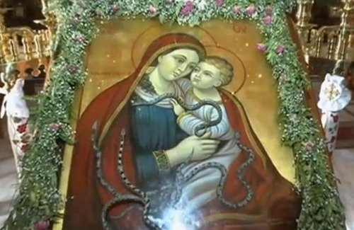 Ядовитые змеи, никого не опасаясь, в этот день даются людям в руки и никого не кусают. Прихожане, не опасаясь, берут их в руки. Вскоре после окончания праздничной службы, змеи сползают с излюбленной ими иконы Богородицы и покидают церковь.