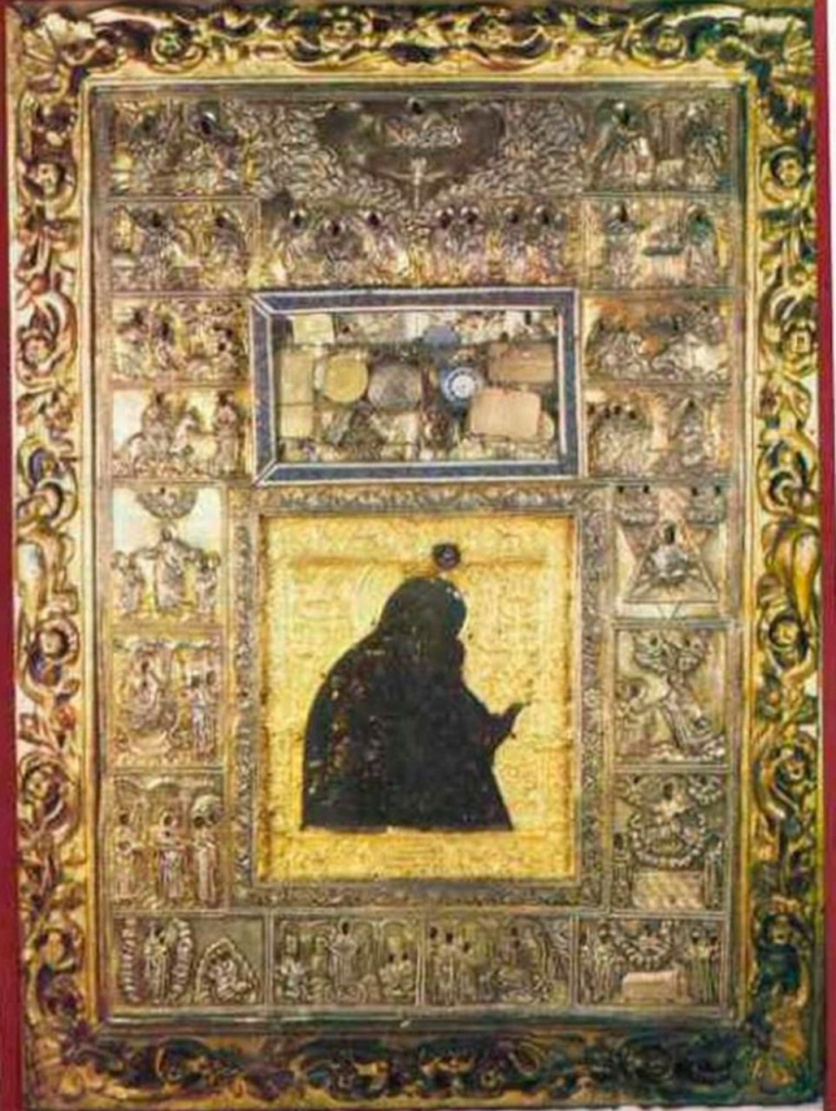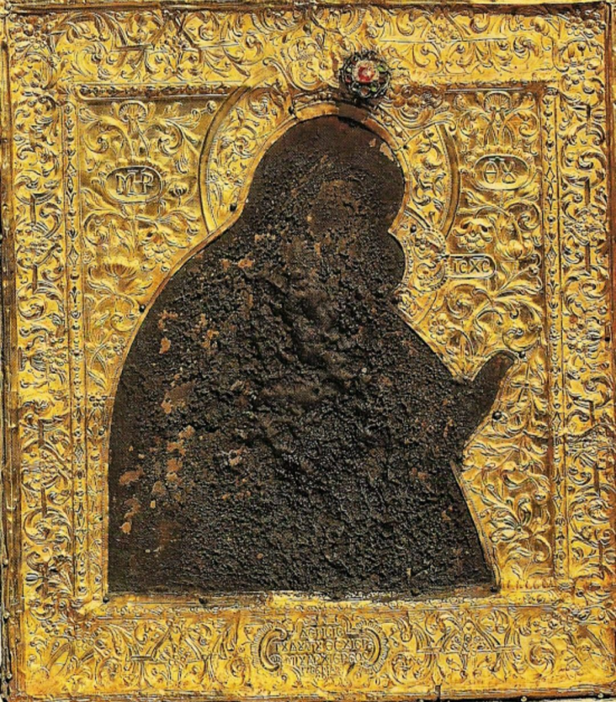 Эту икону держал в руках патриарх Константинопольский Сергий I, обходя стены осаждённого аварами Константинополя (624 г.), о чем свидетельствует надпись на ней на греческом языке: «Эта чудотворная икона есть та, что держал патриарх Сергий, обходя стены Константинополя, и изгнал врагов, и её император Алексей Комнин своими руками подарил св. Дионисию». Заступничеством Пресвятой Богородицы неприятельский флот был рассеян штормом и город спасен. Перед этой иконой впервые был совершен Акафист Пресвятой Богородице.