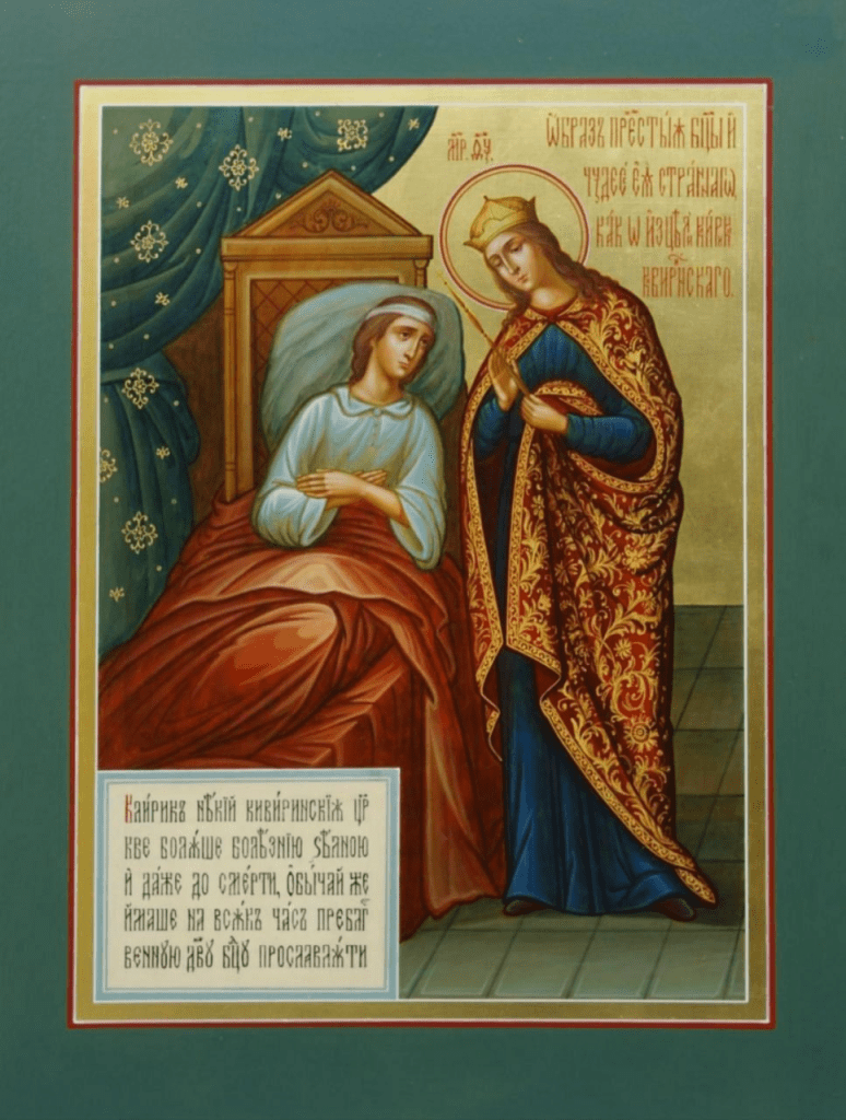 И вот ,когда лежал он на одре болезни и готовился к смерти, является ему вдруг Пресвятая Владычица наша Богородица и, чуть приоткрыв девический Свой сосок и стиснув его, окропляет млеком уста болящего и становится невидима. От сего случившегося вскочил больной, быстро облекся в клирические свои ризы и побежал в церковь. Войдя в хор, он стал на своем месте посреди поющих клириков, изумляющихся и трепещущих от внезапной перемены в нем и негаданного выздоровления — ведь никто уже не чаял видеть его живым. Когда же спросили о причине его здравия, тогда открыл он пред всеми, прославляя Целебницу свою Премилостивую, как покропила Она уста его — следы того млека еще оставались на его устах… О, преславное чудо!