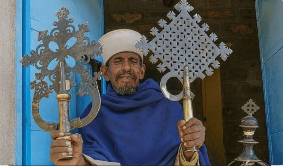 Эфиопский крест отличается от латинского креста: его квадратный дизайн представляют Ковчег, сохраняя при этом классическую форму Креста. Вместе они являются старым и новым заветами.