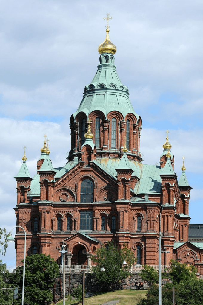 Успенский собор Пресвятой Богородицы в Хельсинки — главный православный храм финской столицы и крупнейший собор а Северной и Западной Европе. Храм был возведён в 1862 -1868 годах по проекту русского архитектора Алексея Горностаева. Общая высота Собора — 51 метр, высота самого купола 33 метра — число лет жизни Христа. Звёздное небо на сводах — образ Небесного Царства. Построен в русском архитектурном стиле с элементами барокко. На соборе 13 позолоченных луковичных куполов, что символизирует Христа и 12 апостолов. На строительство храма было использовано более 700 тысяч кирпичей. Внутри храма роскошный двухъярусный иконостас с изображениями евангелистов, Тайной вечери и воскресшего Христа. В центре храма — люстра с 144 свечами, гранитные резные колонны. Здесь хранятся ценные иконы: великомученицы Варвары, Николая Чудотворца, Козельщанская икона Божией Матери, мощи прп Серафима Саровского и другие.