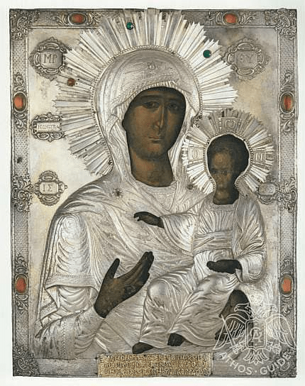 Вы можете найти эту публикацию по следующим поисковым запросом: чудотворная икона Богородицы Одигитрия Палеологина в монастыре Григориат на Афоне, история дара иконы Марией Асениной Палеолог супругой Стефана Великого 1497 год, икона Одигитрия уцелевшая в пожаре храма Григориат 1761 без повреждений, описание типа Одигитрия с серебряным окладом и надписью Деисус Марии Асен Палеолог, связь семьи Палеологов с восстановлением монастыря Григориат конец XV века, проскинитарий 1880 года с иконой Богородицы Палеологина в главном соборе Григориат, иконография Путеводительницы с закрытым свитком и поздними слоями краски XVII век Афон
