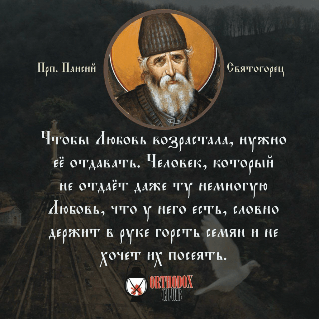 Чтобы любовь возрастала, нужно её отдавать. Человек, который не отдаёт даже ту немного любовь, что у него есть, словно держит в руке горсть семян и не хочет их посеять. — Прп. Паисий Святогорец