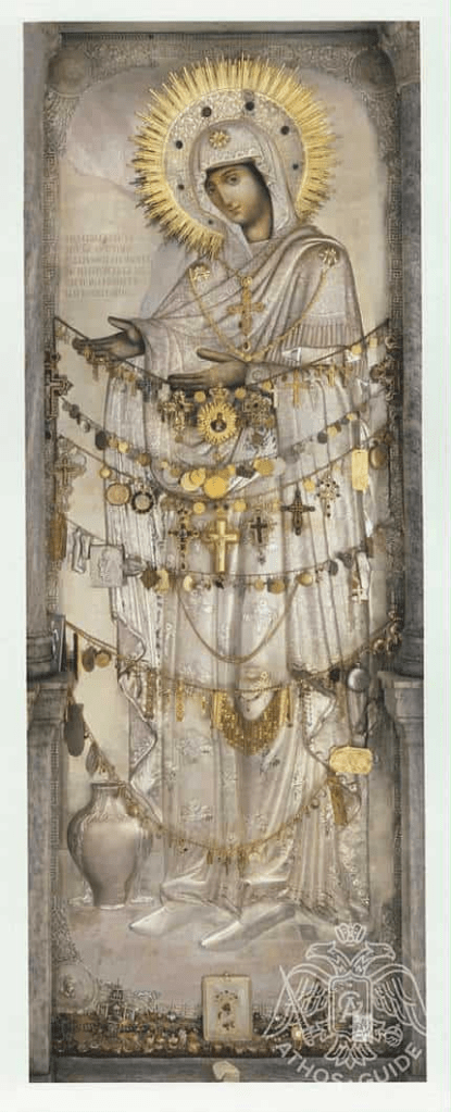 На чудотворной иконе монастыря Пантократор Богородица изображается в полный рост, с поворотом корпуса влево, в жесте благословения, в роли посредника перед Христом, согласно типу иконографии Богородицы Агиоритиссы или Параклисис («Просительница»). Этот тип Богородицы появляется довольно рано и отражается в разных видах искусства (фрески, иконы, барельефы и так далее) на протяжении всего византийского периода истории
